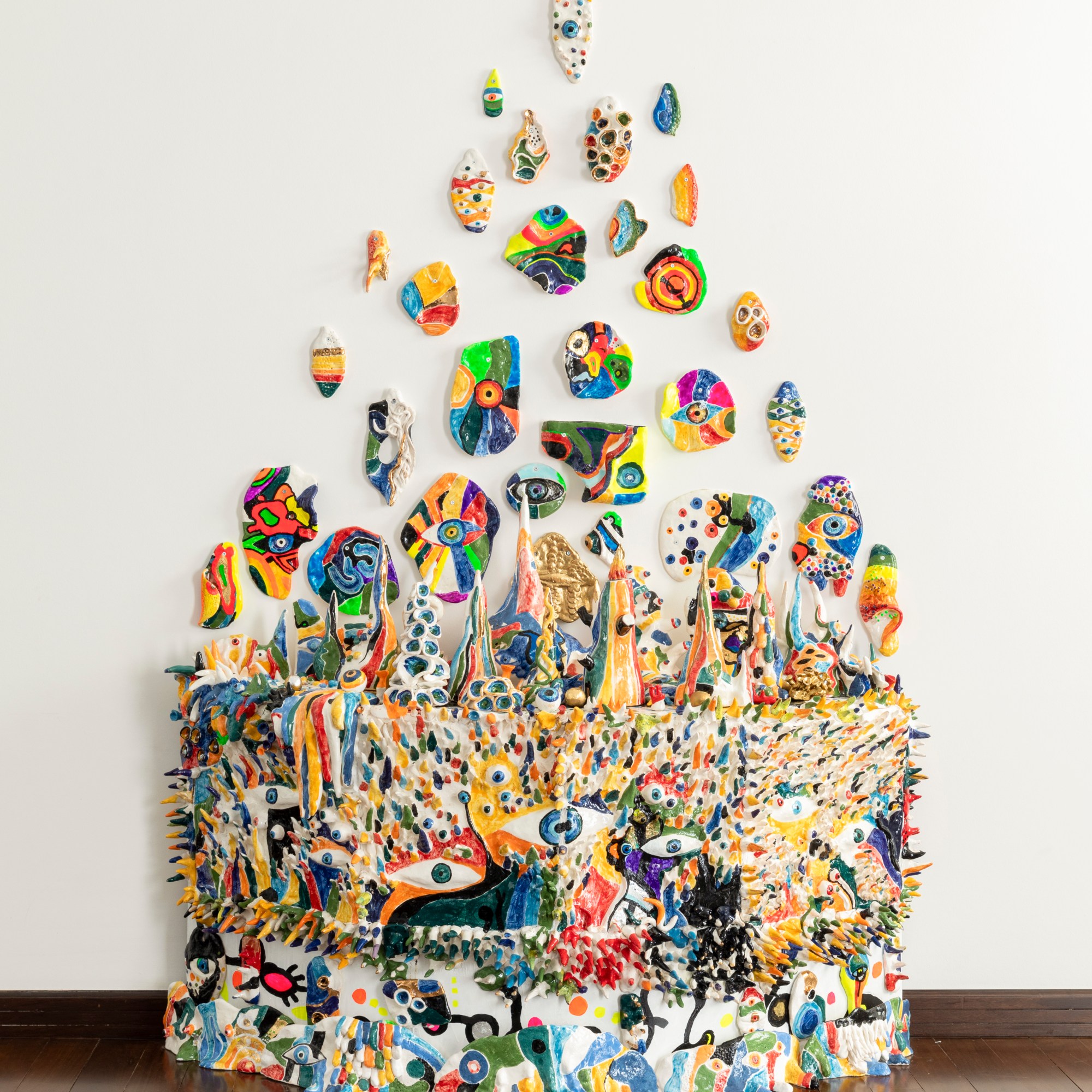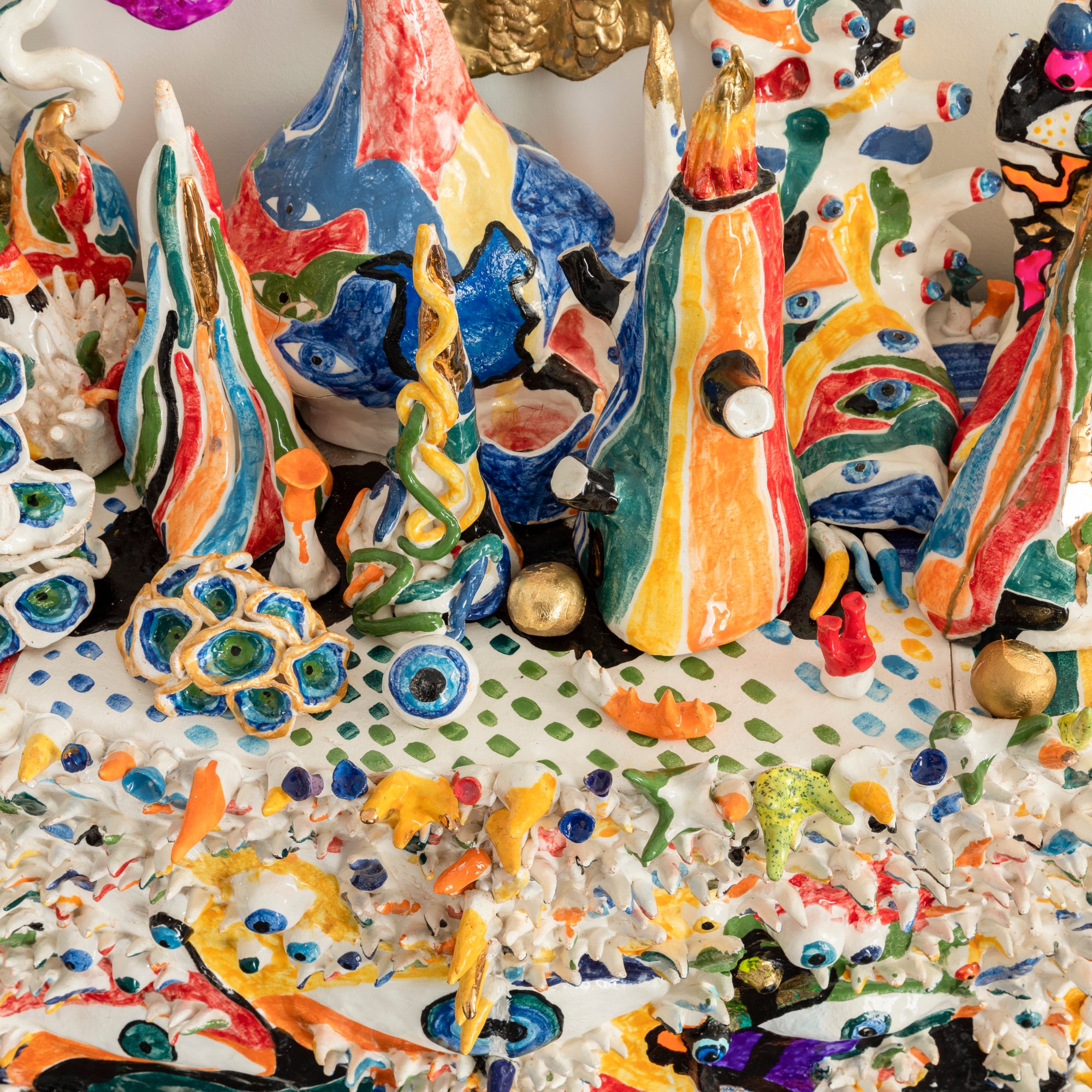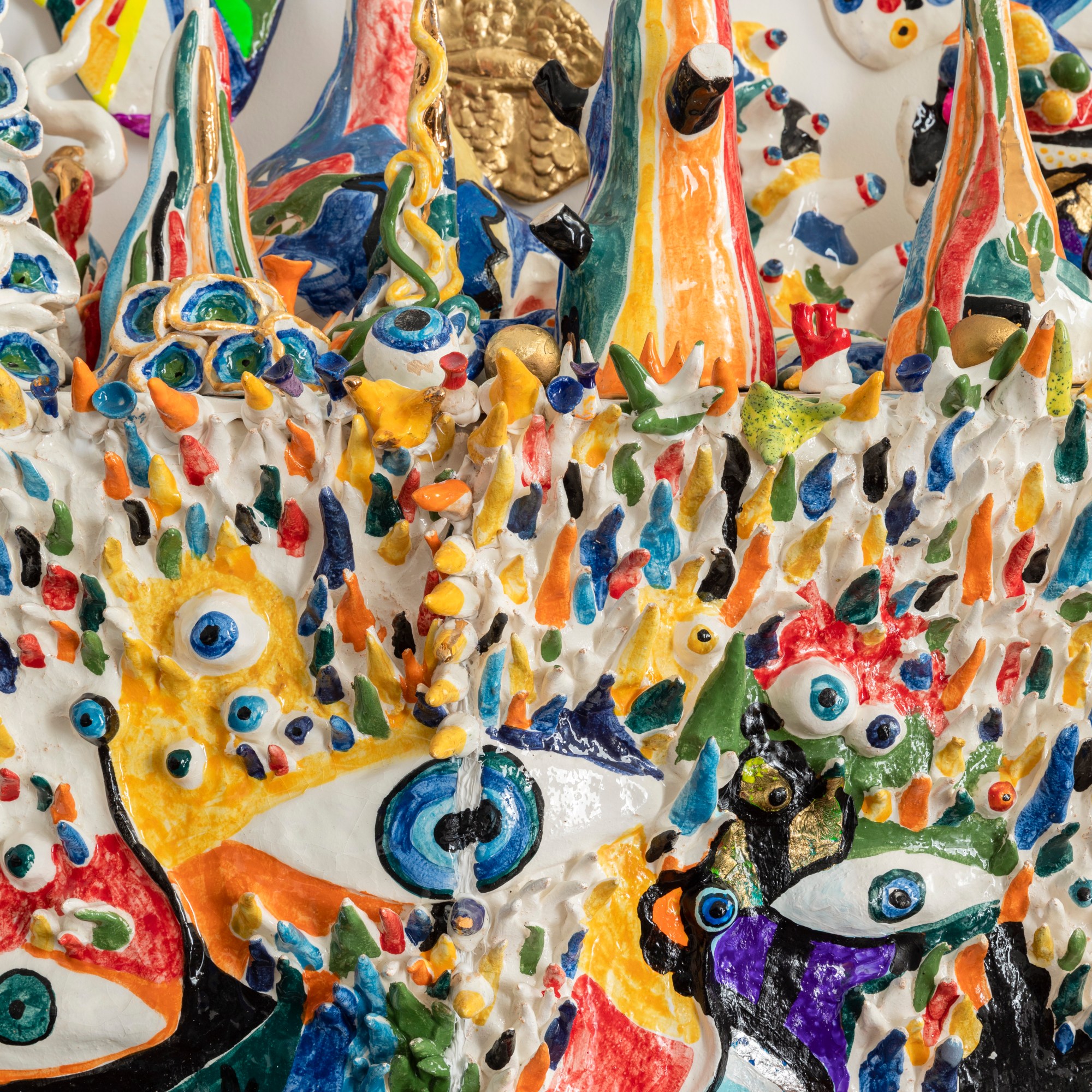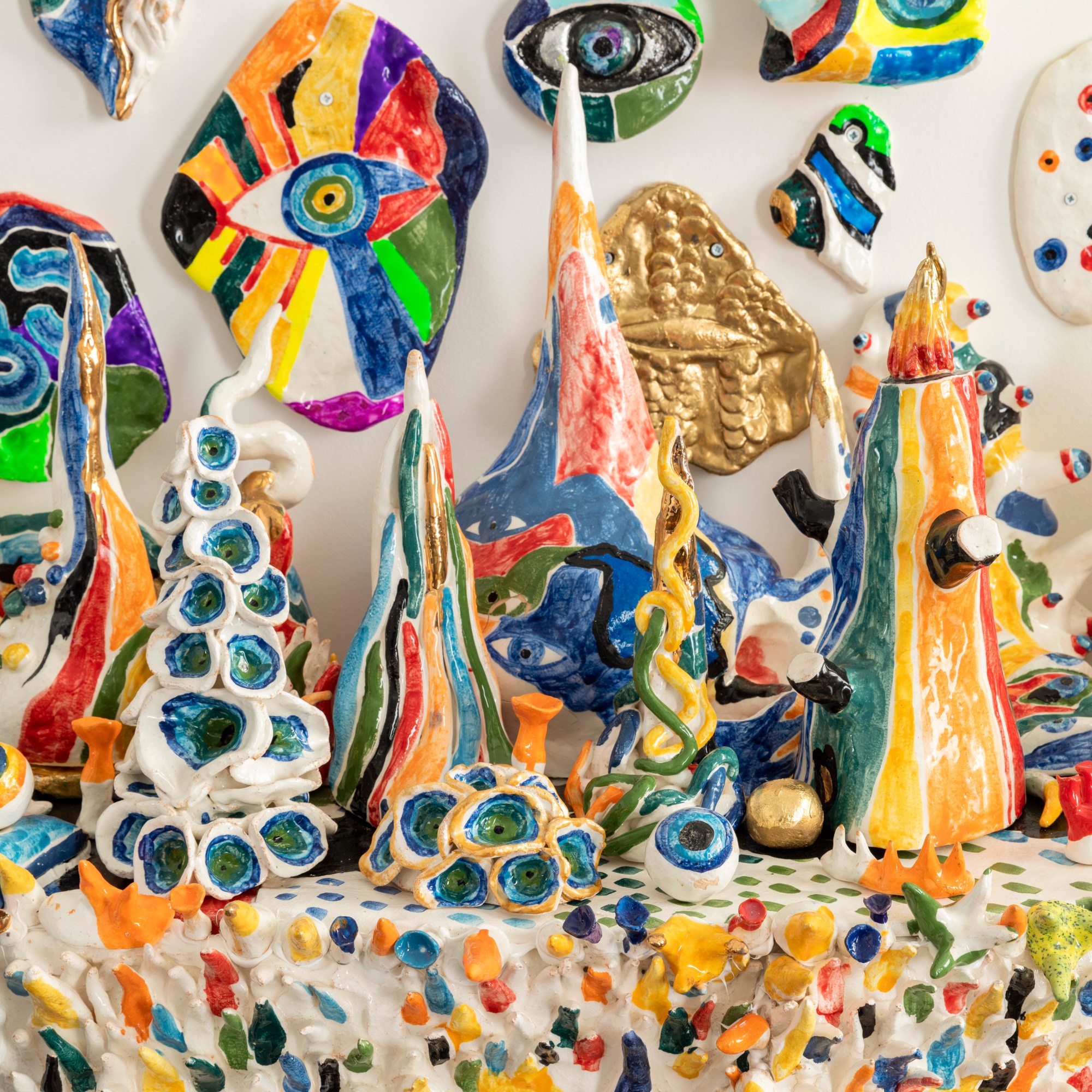 “ the forest with eyes”. 180/120cm ceramic, wood, plexiglass, gold.