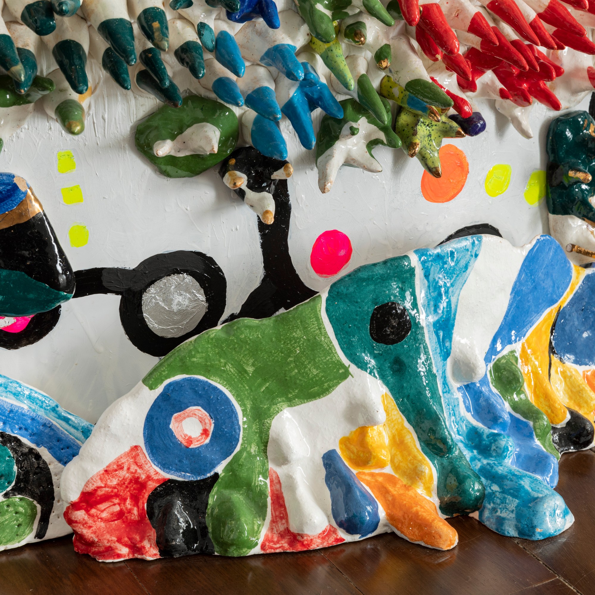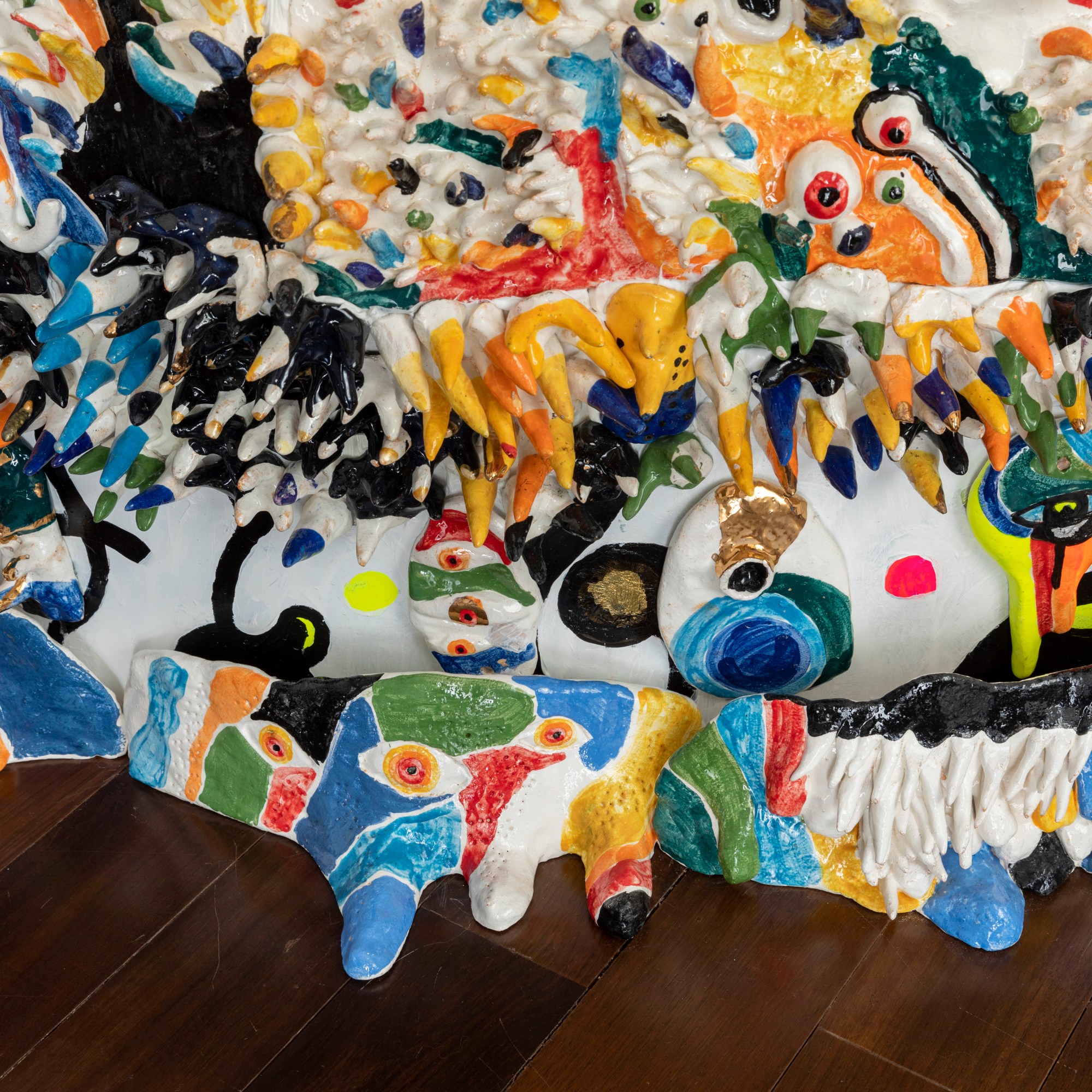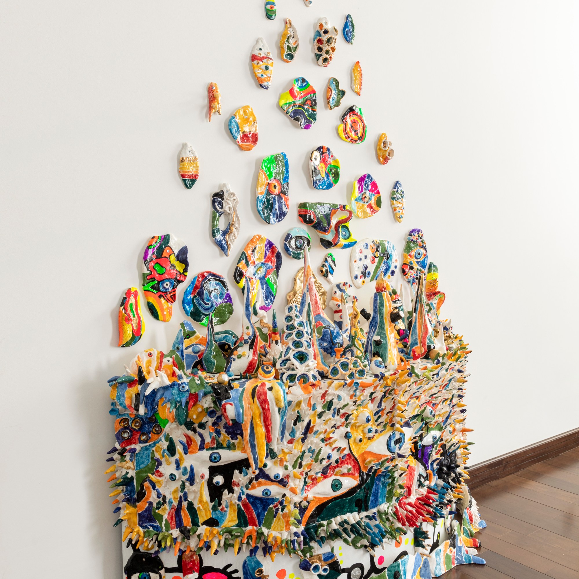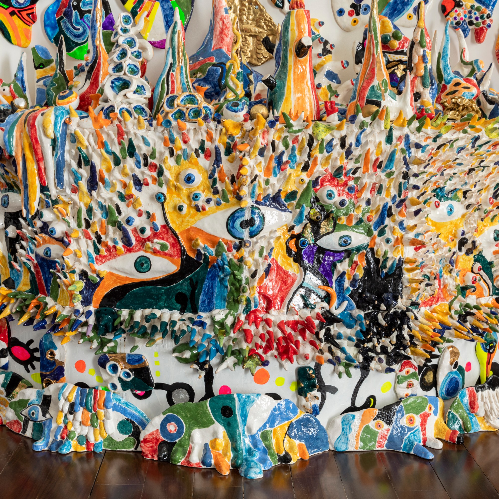 “ the forest with eyes”. 180/120cm ceramic, wood, plexiglass, gold.